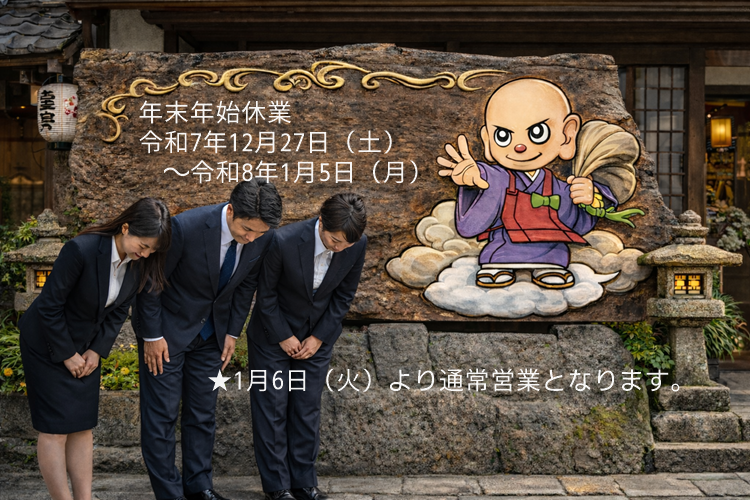 誠に勝手ながら、下記を年末年始休業期間とさせていただきます。尚、お問合せフォームはいつでもご利用いただけます。休業期間中のお問合せに関しましては、令和8年1月6日(火)以降に順次ご連絡させていただきます。ご不便をおかけいたしますがご理解お願いいたします。